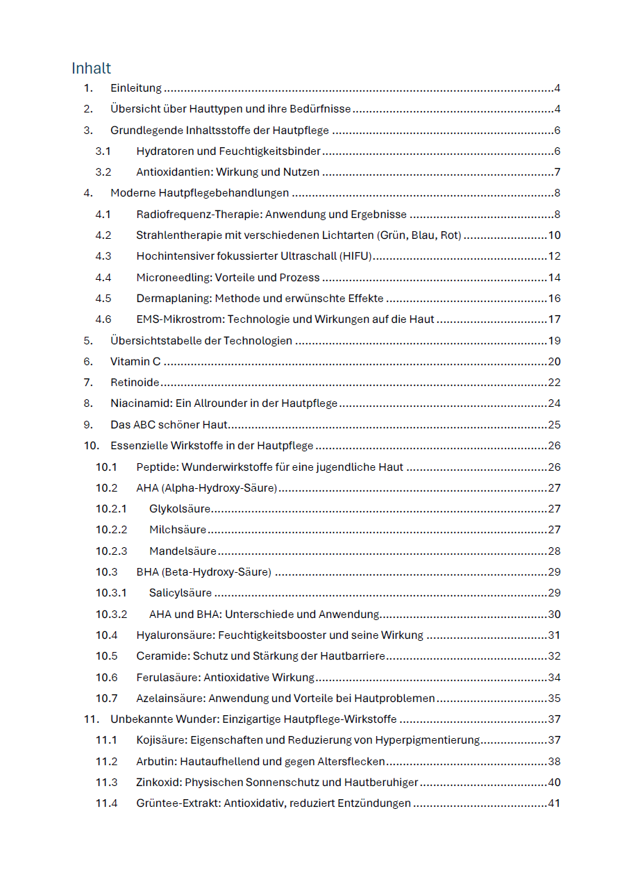 Das E-Book deckt über 20 hochwirksame Inhaltsstoffe ab – von Klassikern wie AHA (Alpha-Hydroxysäuren), BHA (Beta-Hydroxysäuren), Vitamin C und Niacinamid bis hin zu innovativen Wirkstoffen wie Panthenol (Vitamin B5), Allantoin, Teebaumöl und Schneckenschleim. Jeder Inhaltsstoff wird ausführlich mit Nutzen, Wirkung und Anwendung erklärt, abgestimmt auf verschiedene Hauttypen.